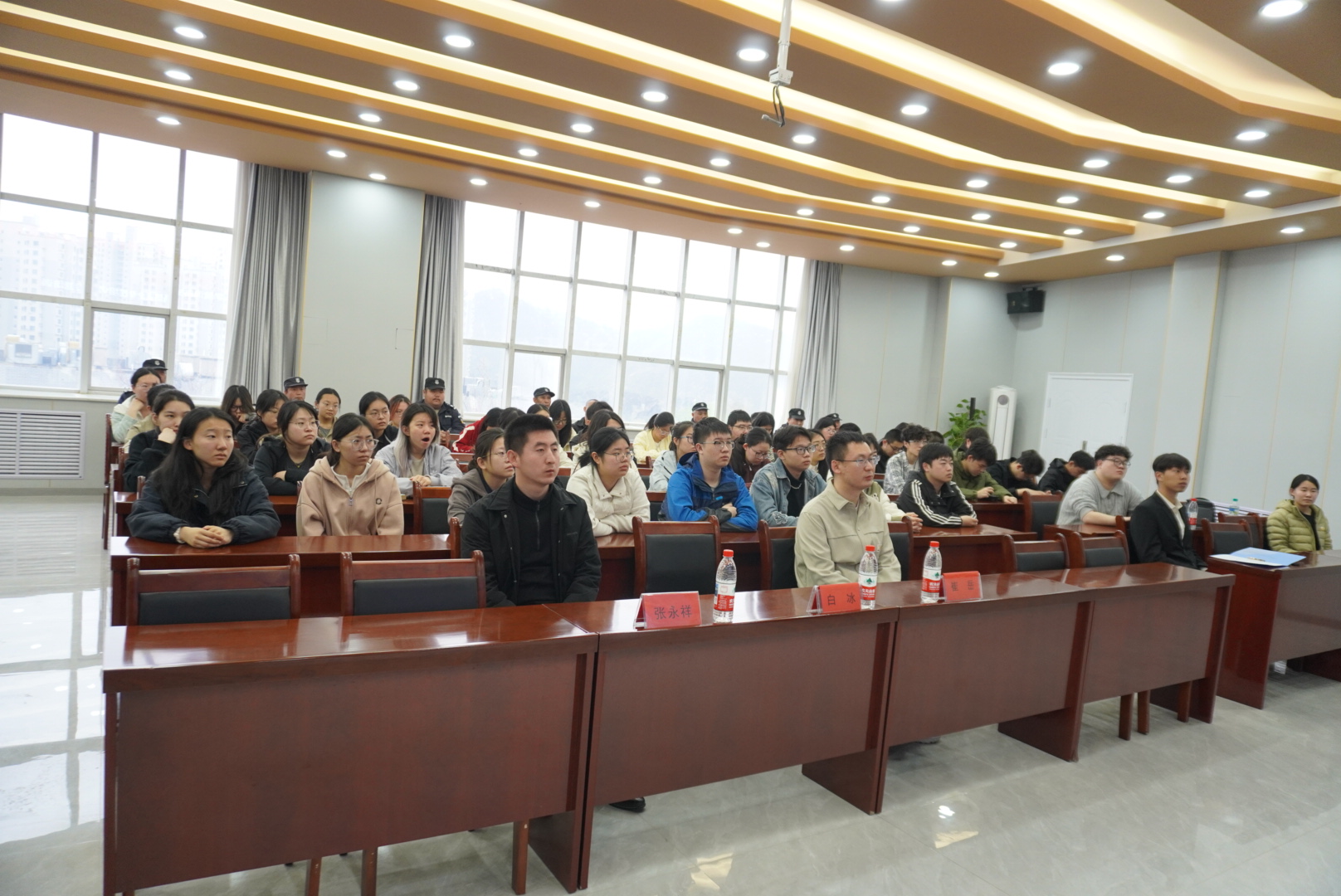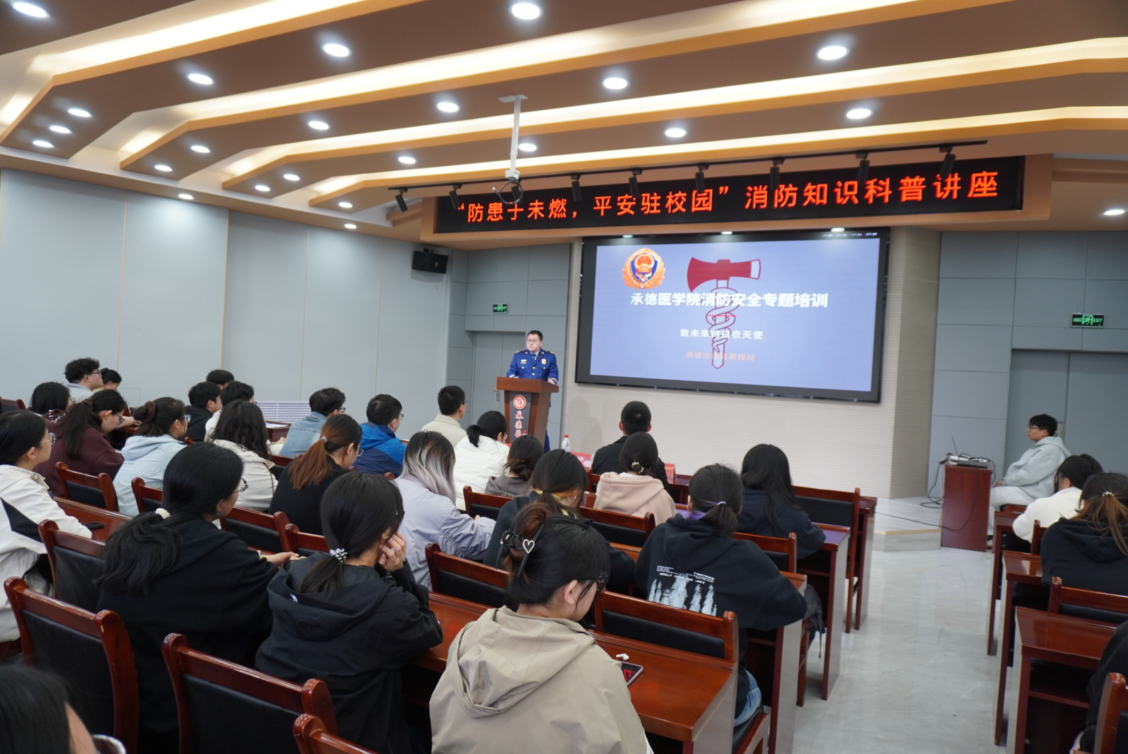为全面提升师生及安保人员消防安全素养,夯实校园消防安全基础,4月17日上午,学校安全工作处联合承德市消防支队,为基础医学院2023级学生及校内消防安保人员举办了一场内容丰富、实用性强的消防安全知识讲座。承德市消防支队宣传科科长白冰担任主讲,安全工作处张永祥老师出席活动。 讲座中,白冰结合自身多年消防一线工作经验,围绕高校火灾特点、常见火灾隐患、初起火灾扑救及火场逃生自救等内容展开讲解。他运用大量真实校园火灾案例,以图文并茂、视频还原的方式,深入剖析了宿舍违规用电、实验室操作不当、食堂明火管理疏漏等常见火灾诱因,详细讲解了灭火器、消火栓等消防器材的正确使用方法,以及火场中“低姿捂鼻、沿墙快行”的逃生要领。针对消防安保人员的工作实际,白冰重点强调了日常防火巡查要点、火灾报警流程及初起火灾处置程序,要求保安人员切实履行“第一响应人”职责。 讲座现场气氛热烈,同学们认真聆听、积极互动。大家纷纷表示,通过此次讲座,对消防安全有了更直观、更深刻的认识,掌握了实用的防火逃生技能。 此次讲座是我校深化校地合作、推进平安校园建设的重要举措,有效增强了师生及安保人员的消防安全意识和自防自救能力。下一步,安全工作处将持续开展形式多样的消防安全宣传教育活动,不断筑牢校园安全防线,全力保障师生生命财产安全。